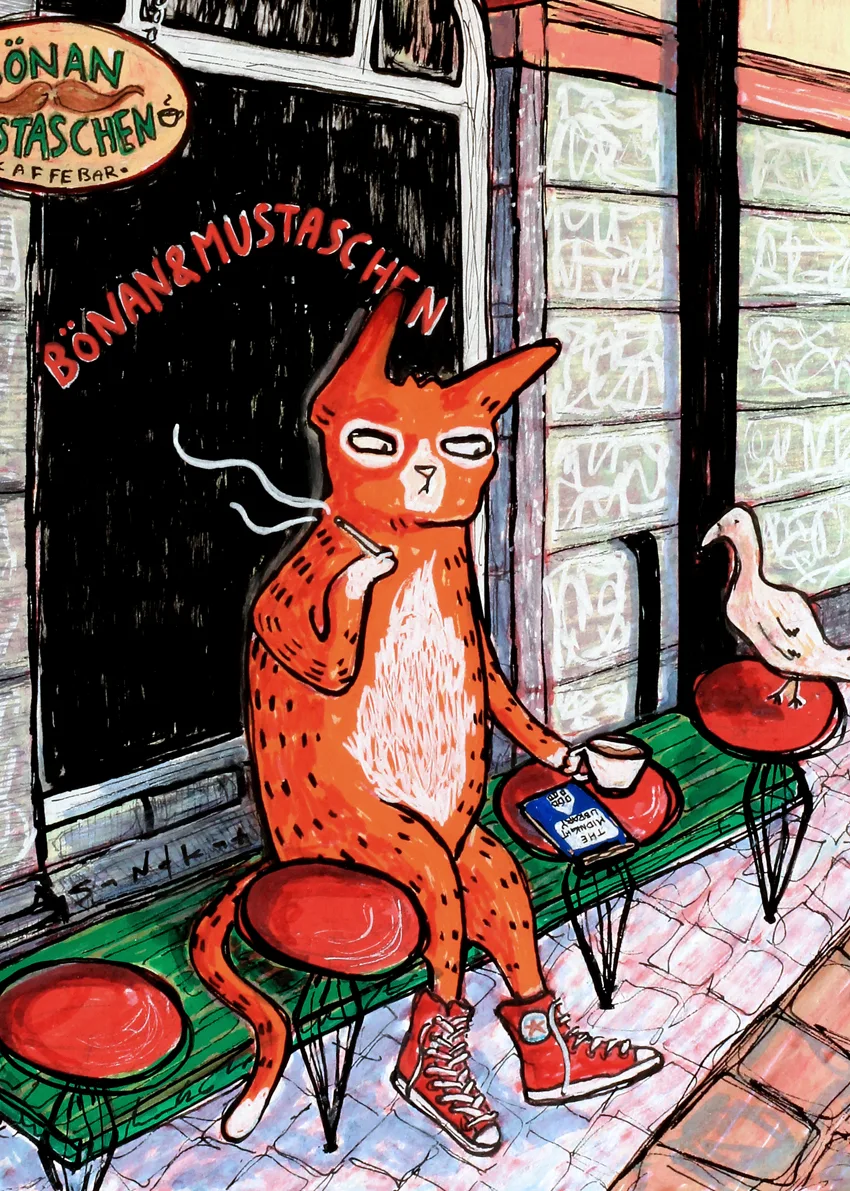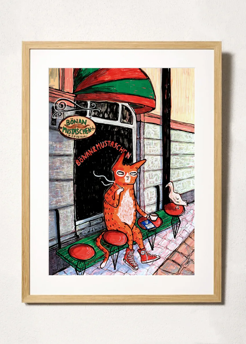 Konsttryck av originalillustrationen ”Cafékultur, Bönan & Mustaschen, Växjö”.